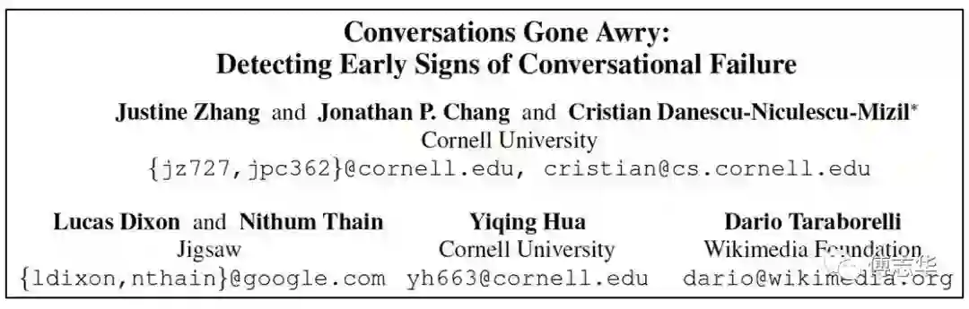 Conversations Gone Awry: Detecting Early Signs of Conversational Failure. Lucas Dixon,Nithum Thain,YiqingHua and Dario Taraborelli.