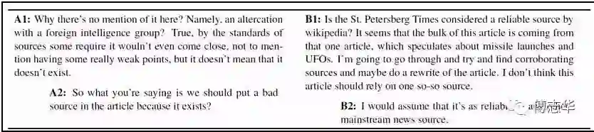 论文中提到的例子是是关于“Dyatlov Pass Incident” 的两组维基百科的网友讨论(Dyatlov事件是指1959年2月2日晚发生在乌拉尔山脉北部的9位滑雪登山者离奇死亡的事件。这个团队的队长叫做Dyatlov,他们在登“死亡之山”的东脊时发生事故,10人9死)。其中A1和A2为一组(见下图),分别为两位不同的网友;B1和B2为一组,也是两位不同的网友。A1开始交流,A2用另一个问题反问。相反,B1更温和,用“似乎”提出了意见,B2实际上解决问题,而不是搪塞。这两组讨论中有一组讨论导致对话失控,一个对话者开始进行个人攻击。