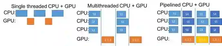 一个更好的解决方案是将两个或多个神经网络子集与模拟器配对,并且始终保持 GPU 和 CPU 同时运行,这取决于准备采取哪一个步骤(神经网络或模拟器)来更新来自不同集合的网络或模拟器。这种方法是最右边的「流水线 CPU + GPU」选项,如下图右 1 所示。通过它以及上文提到的其他改进,使得我们训练 4 百万参数的神经网络所需时间降到在一台计算机上只需 4 小时。