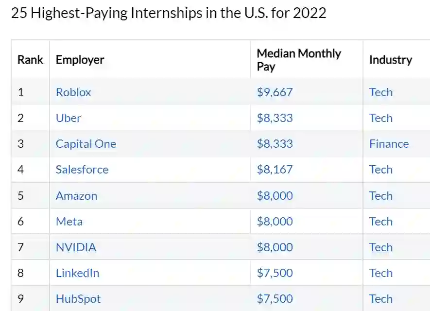 亚马逊不仅实习生招收得多,而且薪资也不低。Glassdoor调查了2021年2月到2022年2月期间美国实习生的工资,其中游戏公司Roblox提供的薪水最为丰厚,实习生月薪中位数高达10,000美元。而Uber和Capital One紧随其后,其实习生月薪中位数都是8,333美元。而亚马逊的技术岗位的薪资排名第五,达到8,000元美金,也是相当可观的。