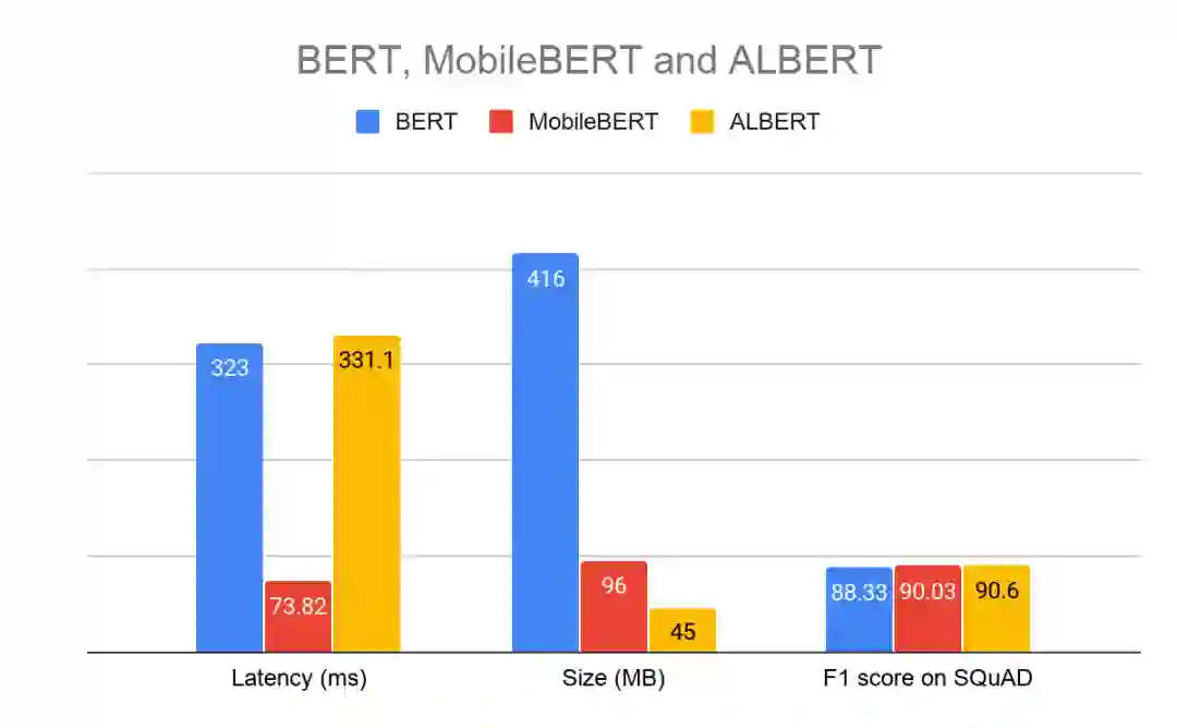 ALBERT 是 BERT 的另一个轻量级版本,在保持相同准确率的同时对模型大小进行了优化。ALBERT-Lite 是兼容 TensorFlow Lite 的 ALBERT 版本,体型仅为 BERT 的 1/6(比 MobileBERT 小 1.5x),但延迟与 BERT 相当。