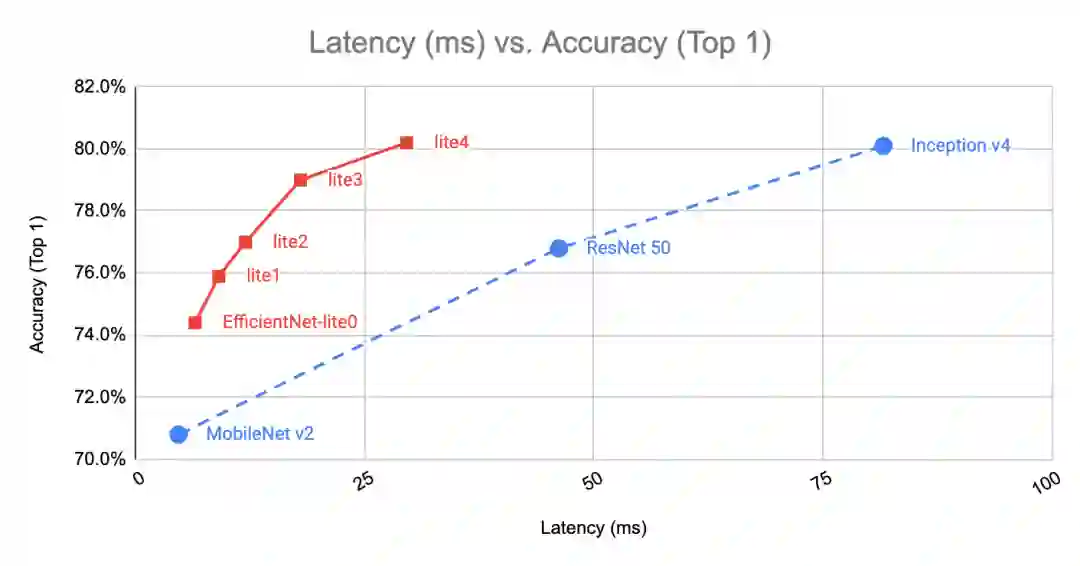 EfficientNet-Lite 是一种新型图像分类模型,可在使用更少参数、消耗更少算力的情况下,达到目前最佳准确率。模型针对 TensorFlow Lite 进行了优化,不仅支持量化且准确率损失微乎其微,还完全受 GPU Delegate 支持,可实现更快速的推理。如需了解详情,请参阅我们的文章。
