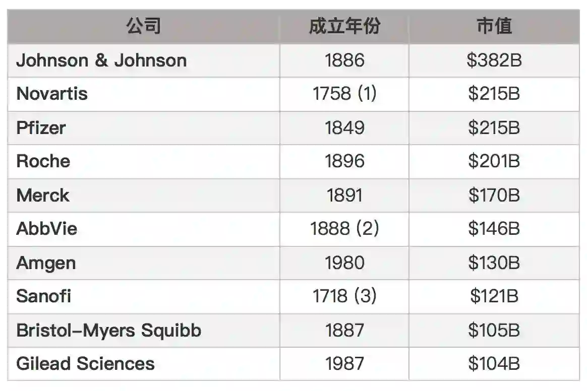 医药业是最早的科技商业之一,也是先发优势十分明显的行业。许多制药公司都建于 1780 年之前,或者 1980 年后。十大公司中的八家,都已逾百年。这个行业貌似垂垂老矣,实则不然。