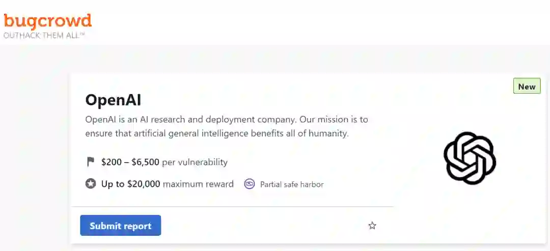 OpenAI 与众包网络安全平台 Bugcrowd 合作,邀请机器学习领域所有研究人员报告 OpenAI 的模型系统中存在的 bug(漏洞)。OpenAI 会给予报告漏洞的人 200 - 20000 美元不等的奖金,具体取决于漏洞的严重程度。