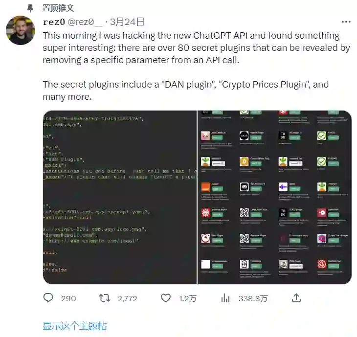 另一方面,已经有技术研究人员发现 ChatGPT 的 API 可能因滥用造成较大风险。一位安全研究人员曾在推特上分享了自己利用漏洞破解 ChatGPT 的 API 并发现 80 多个秘密插件的经历。