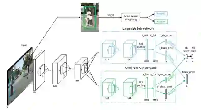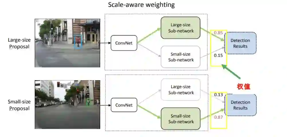 作者针对行人检测的特点对Fast R-CNN进行了改进,由于大尺寸和小尺寸行人提取的特征显示出显着差异,作者分别针对大尺寸和小尺寸行人设计了2个子网络分别进行检测。利用训练阶段得到的scale-aware权值将一个大尺度子网络和小尺度子网络合并到统一的框架中,利用候选区域高度估计这两个子网络的scale-aware权值,论文中使用的候选区域生成方法是利用ACF检测器提取的候选区域,总体设计思路如下图所示: