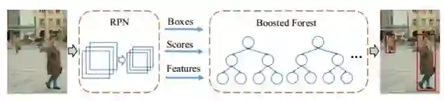 文献[16]分析了Faster R-CNN在行人检测问题上的表现,结果表明,直接使用这种算法进行行人检测效果并不满意。作者发现,Faster R-CNN中的RPN网络对提取行人候选区域是相当有效的,而下游的检测网络表现的不好。作者指出了其中的两个原因:对于小目标,卷积层给出的特征图像太小了,无法有效的描述目标;另外,也缺乏难分的负样本挖掘机制。作者在这里采用了一种混合的策略,用RPN提取出候选区域,然后用随机森林对候选区域进行分类。这一结构如下图所示:
