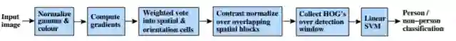 这一特征很好的描述了行人的形状、外观信息,比Haar特征更为强大,另外,该特征对光照变化和小量的空间平移不敏感。下图为用HOG特征进行行人检测的流程: