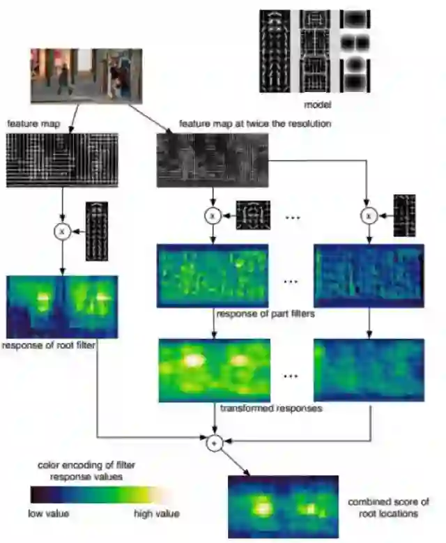 DPM(Deformable Parts Models)算法在SIGAI在之前的文章“基于深度学习的目标检测算法综述”已经提到过。这是是一种基于组件的检测算法,DPM检测中使用的特征是HOG,针对目标物不同部位的组建进行独立建模。DPM中根模型和部分模型的作用,根模型(Root-Filter)主要是对物体潜在区域进行定位,获取可能存在物体的位置,但是是否真的存在我们期望的物体,还需要结合组件模型(Part-Filter)进行计算后进一步确认,DPM的算法流程如下: