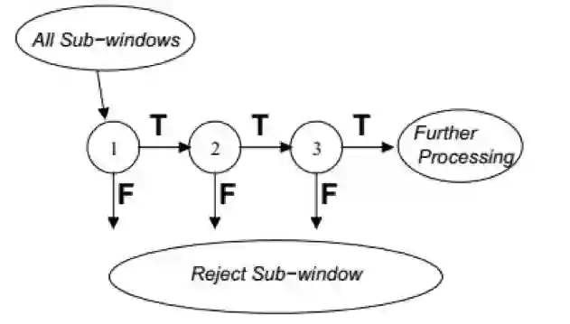 图中每一级中的分类器都是利用AdaBoost算法学习到的一个强分类器,处于前面的几个强分类器由于在分类器训练的时候会优先选择弱分类器,可以把最好的几个弱分类器进行集成,所有只需要很少的几个就可以达到预期效果,计算会非常简单,速度很快,大部分背景窗口很快会被排除掉,剩下很少一部分候选区域或通过后续的几级分类器进行判别,最终整体的检测速度有了很大的提升,相同条件下的预测时间只有基于SVM方法的十分之一。