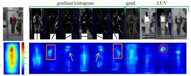 6 个方向的梯度直方图,3 个LUV 颜色通道和1 梯度幅值,见下图,这些通道可以高效计算并且捕获输入图像不同的信息。