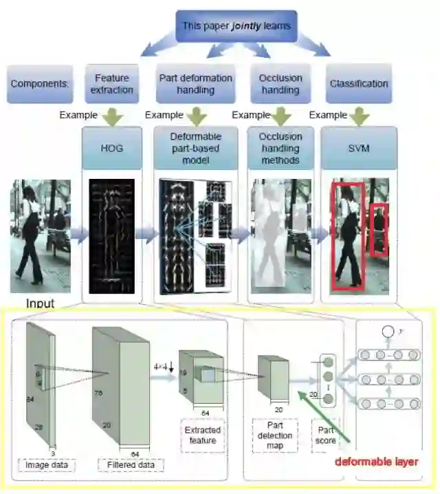 行人检测中的一大难题是遮挡问题,为了解决这一问题,出现了采用部件检测的方法,把人体分为头肩,躯干,四肢等部分,对这些部分分别进行检测,然后将结果组合起来,使用的典型特征依然是HOG,采用的分类器有SVM和AdaBoost。针对密集和遮挡场景下的行人检测算法可以阅读文献[15]。