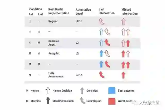 他们研究了6种驾驶模式,分别是单人驾驶模式、单机驾驶模式(全自动驾驶汽车)以及双驾驶员(两个人类或两个机器)的不同组合模式。这些模式分别对应无人车的6个等级,从L0到L5。比较典型的是,L2级的丰田Guardian Angel被归类为H-M模式,即人类(H)是主驾驶,机器(M)是副驾驶;L3级的特斯拉Autopilot被归类为M-H模式,即机器是主驾驶,人类是副驾驶。