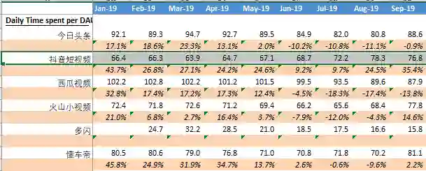 QM上关于抖音和快手的DAU数据的数字反正总是和两家有一些差距,总体上对这两家的监控似乎不是太准,但大趋势上基本问题不大(比如2019年8月-9月期间抖音和快手受开学影响产生的DAU的负增长)。