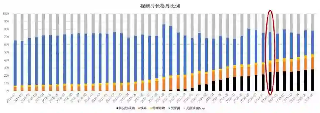 2018年12月,抖音快手单月时长在视频领域的占比第一次超过了爱优腾三家