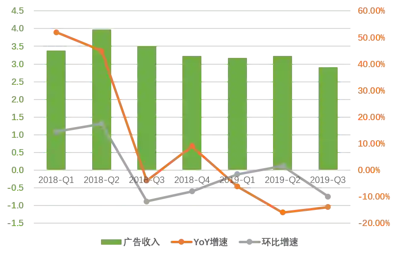 爱奇艺广告收入增速自18年Q3开始断崖式下滑,目前环比与同比负增长