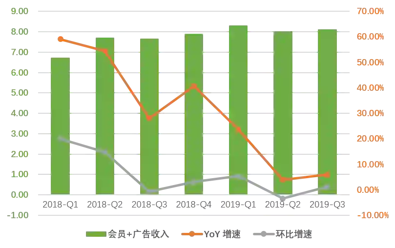 会员+广告两块收入的同比与环比增速2019年在快速下降,明显进入瓶颈期