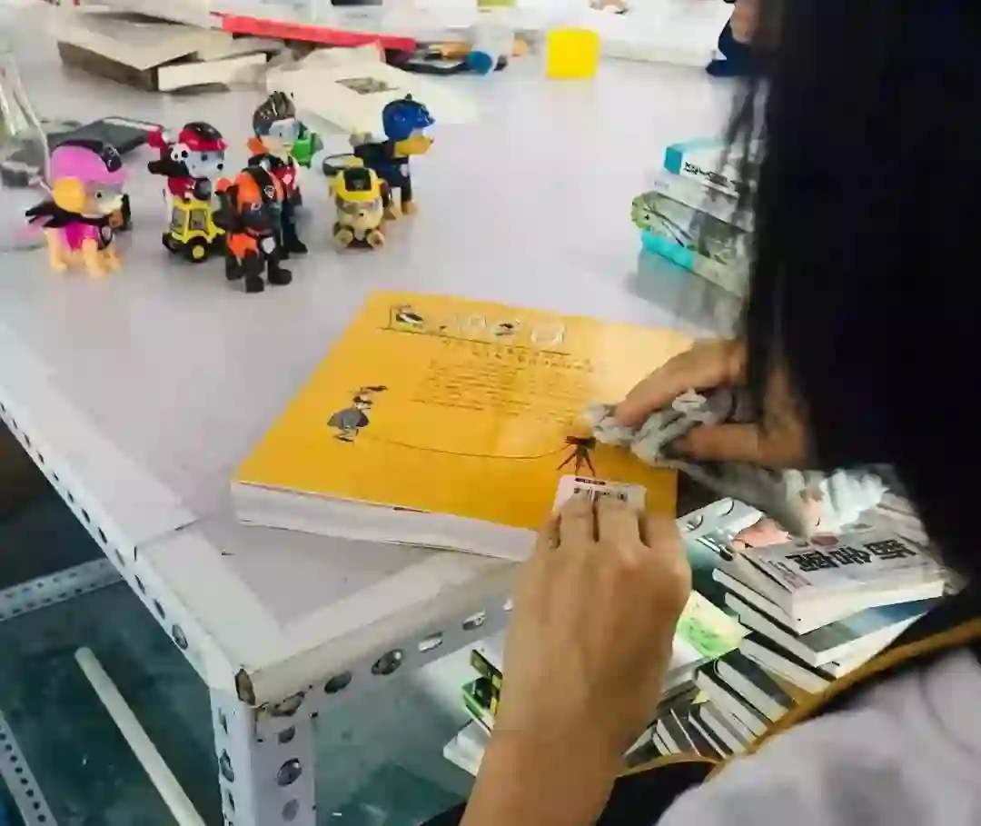 收到书籍后,“漫游鲸”工作人员会先把书上的污渍擦干净,拿砂纸打磨书的边缘,摸酒精去污翻新,再把书放在臭氧箱里消毒杀菌,最后才会给书塑封包装,送到你手上。