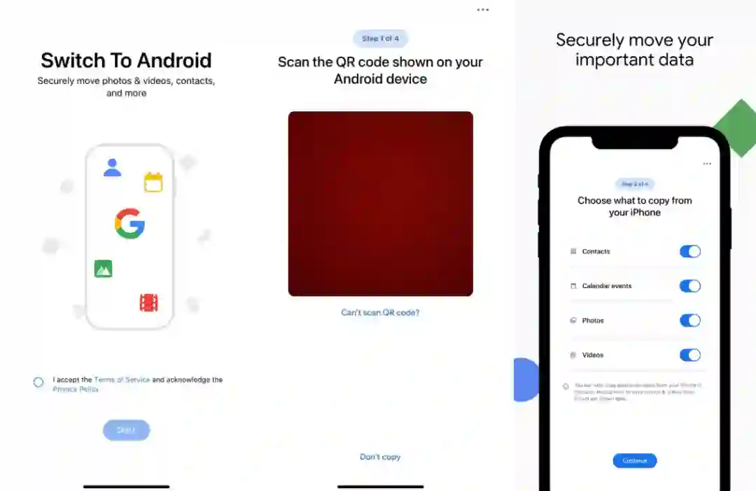 勾选服务条款。告知用户能从 iPhone 复制到新 Android 手机的确切内容,其中包括“照片、视频、联系人等”。