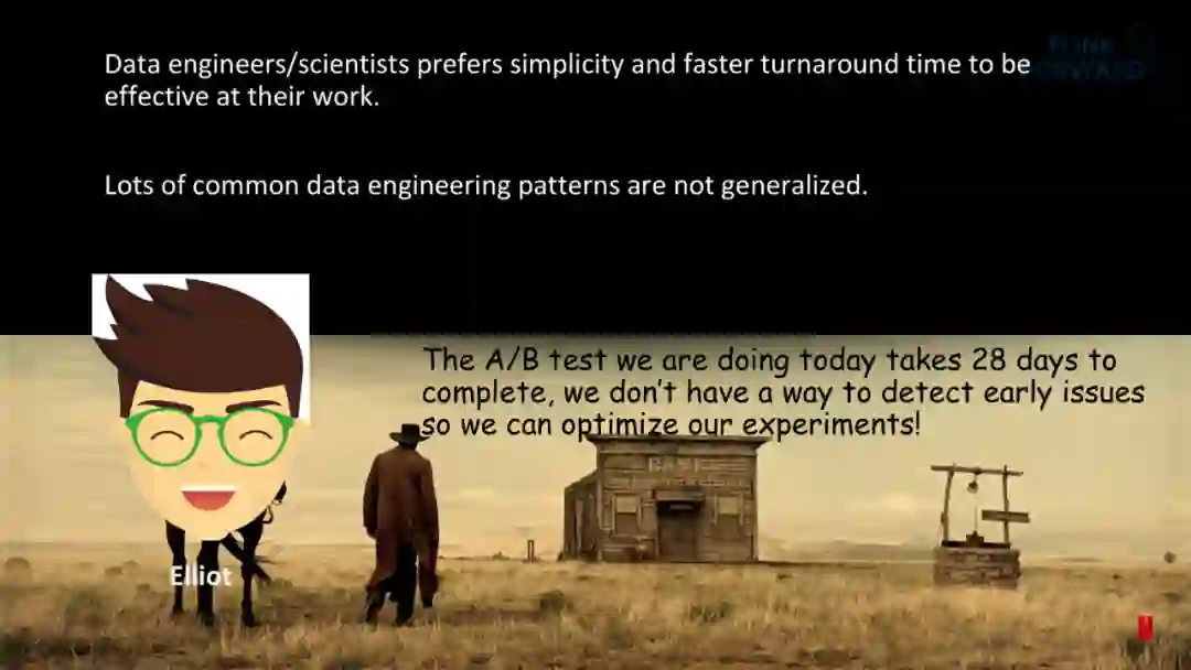 产品功能介绍将围绕 Netflix 中的两个“超级英雄” Elliot 和 Charlie 来展开。Elliot 是来自数据科学工程组织的一个数据科学家,他的需求是在非常大的数据中寻找响应的 pattern,以帮助提高用户体验;Charlie 是一个来自 Studio 组织的应用开发者,其目标是通过开发一系列的应用来帮助周边的其他开发者产出更高质量的产品。