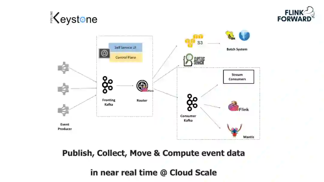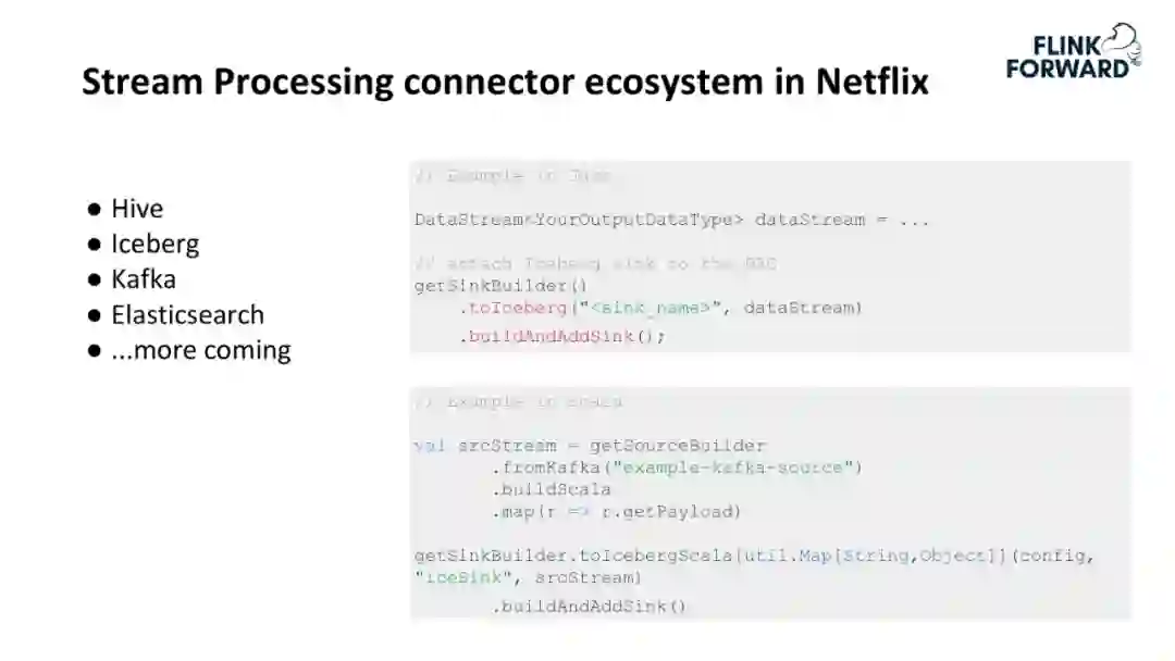 需要强调的是 Iceberg,它是在 Netflix 主导的一个 Table Format,未来计划取代 Hive。其提供了很多特色功能来帮助用户做优化;Keystone 向用户提供了简单的 API,可以帮助其直接生成 Source 和 Sink。