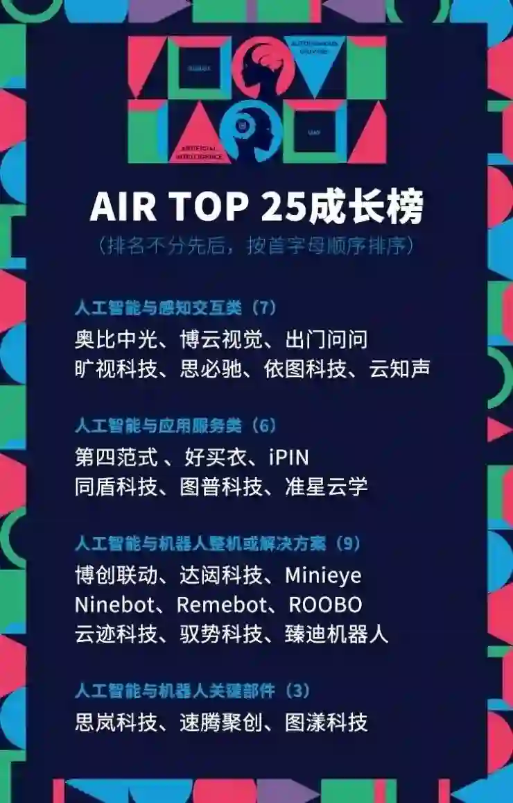 图麟科技、埃尔森智能、理财魔方、纳恩博、鼎界科技、小i机器人 、智能一点、杉数科技、极智嘉科技、海妖情感计算引擎、央数文化、爱啃萝卜、宁波盈芯、远形时空 、极限元、元趣、图普科技、小蚁科技、阅面科技、格灵深瞳、智行者科技、云从科技、班墨、朗空、势必可赢、真机智能、梅卡曼德机器人、速感科技、北醒、贝多多、飔拓、知麻机器人、码隆科技、快商通、三维通、中科汇联、深瞐科技、钢铁侠科技、合合信息、极链、启英泰伦、思必驰、博云视觉、易道博识、人加、南大电子、星图无人机,康夫子、思岚科技、咪鼠科技、地平线机器人技术、乐聚机器人、肽积木科技、声智科技、众安科技、李群机器人、UFACTORY、云知声、钛米机器人、e成科技、欢创科技、再惠、助理来也、小鱼在家、勇艺达机器人、库柏特、博创联动、远传技术、中科慧远、健安华夏
