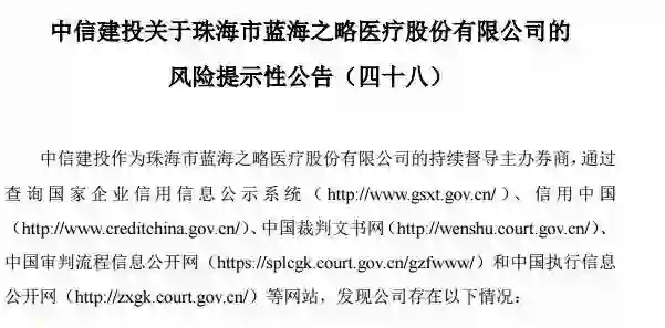 近日,中信建投第四十八次发布关于珠海市蓝海之略医疗股份有限公司(以下简称蓝海之略)的风险提示性公告,公告显示蓝海之略存在几个重大风险事项,具体包括涉及重大未决诉讼仲裁;重大债务违约等财务风险;主要资产被查封、扣押、冻结;停产、批产清算等经营风险;重大亏损、损失或承担重大赔偿责任;公司及关联方涉嫌违法违规;公司未能规范履行信息披露义务。