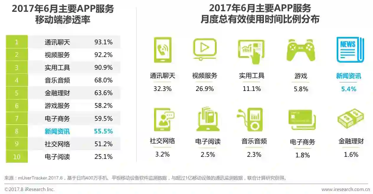 1. 整体资讯类APP在2017年6月覆盖独立设备数达到6.2亿台,越来越成为互联网网民移动设备中的重要组成部分,未来覆盖率将会进一步扩大。从使用时间上来看,移动端用户在新闻资讯上月度使用的时间占比5.4%,用户停留在资讯APP上的时间较长,略低于游戏APP。