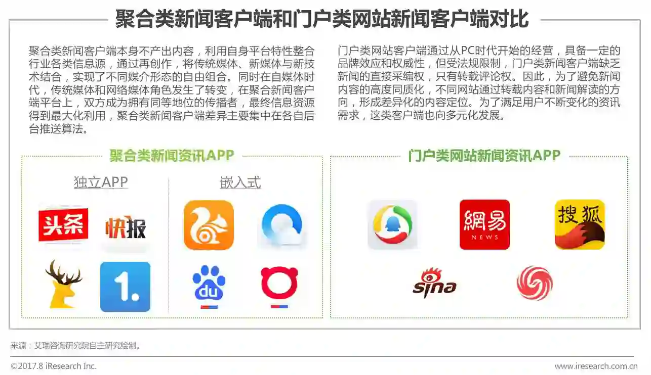 根据产业链图谱展示,目前行业上主流的移动新闻资讯APP分为两种:聚合类新闻资讯APP和门户类网站新闻资讯APP,其中,聚合类新闻客户端分为独立APP和嵌入式APP。嵌入式APP指新闻资讯板块嵌入在工具产类品当中,如UC浏览器。浏览器作为通用性很强的工具,使用黏性高,能够和资讯板块相互导流。目前,工具类、电商类或服务类APP都尝试嵌入资讯功能,避免自身功能单一,同时可以通过信息流广告进行商业变现。