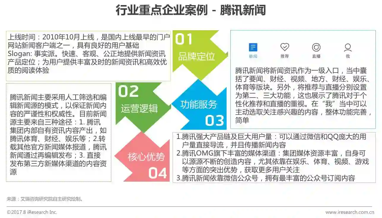 腾讯新闻在拥有微信和QQ两个强大流量入口支撑的情况下,确保了稳定的流量基础,同时再将流量背后的信息加以利用,形成与用户属性匹配的个性化推荐内容。腾讯新闻在具备门户类新闻客户端的基本属性下,向个性化推荐资讯平台延伸。