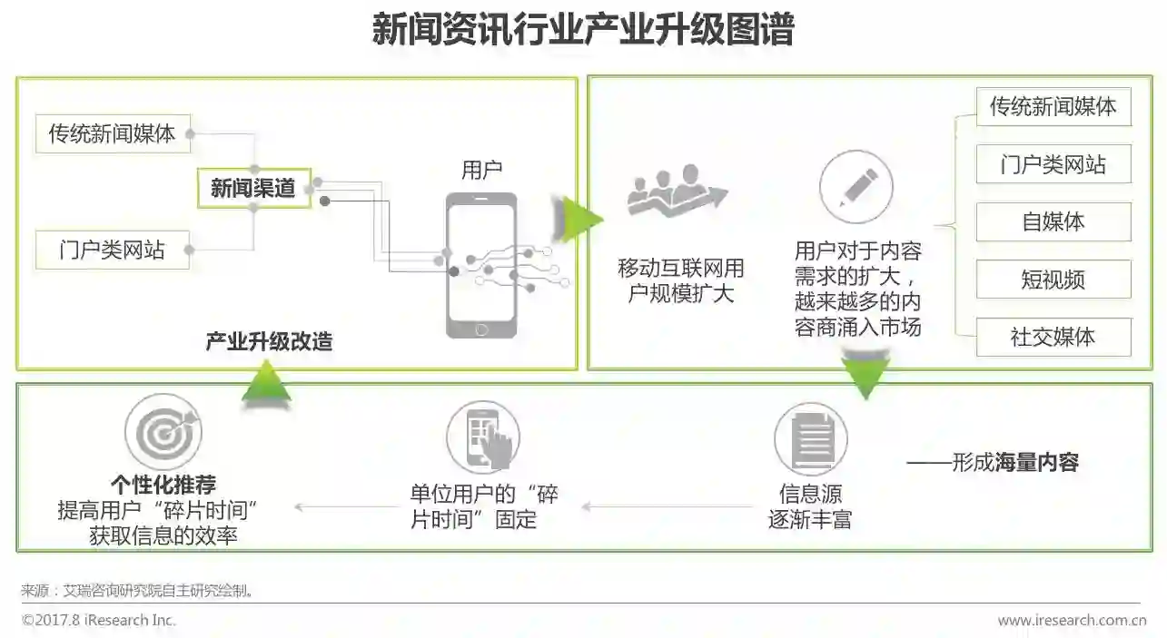 在资讯浪潮来临之前,用户获取新闻资讯的渠道单一,传统新闻媒体和门户类网站的采集编辑是主要渠道。随着移动互联网用户规模的扩大,以及用户对于内容数量和多样性需求的上升,拉动供给端涌入市场。因此,信息源的丰富化和海量内容解决了新闻数量的问题。但是,单位用户的“碎片时间”没有改变,甚至随着内容类产品的丰富和生活节奏的加快,“碎片时间”更加减少和分散。借助强大的数据采集、分类和提取技术,通过个性化推荐选取用户最可能感兴趣的内容填充用户的碎片时间,通过内容和技术,共同驱动新闻资讯产业的升级。