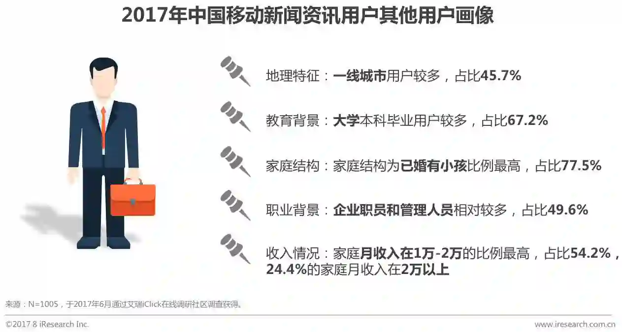 根据调研,样本中新闻一线城市用户占比45.7%;教育背景集中在本科,占比67.2%;家庭结构为已婚有小孩得比例最高,占比77.5%;职业背景以企业员工和一般管理人员为主,占比49.6%;家庭月收入集中在1万-2万,占比54.2%。分析发现,本次调研所描摹的移动新闻资讯用户近似工作于一线城市的白领人群,仍处于成长阶段、价格敏感度较高、对待新鲜事物有一定好奇心、计划消费的同时也有一定购物欲望。
