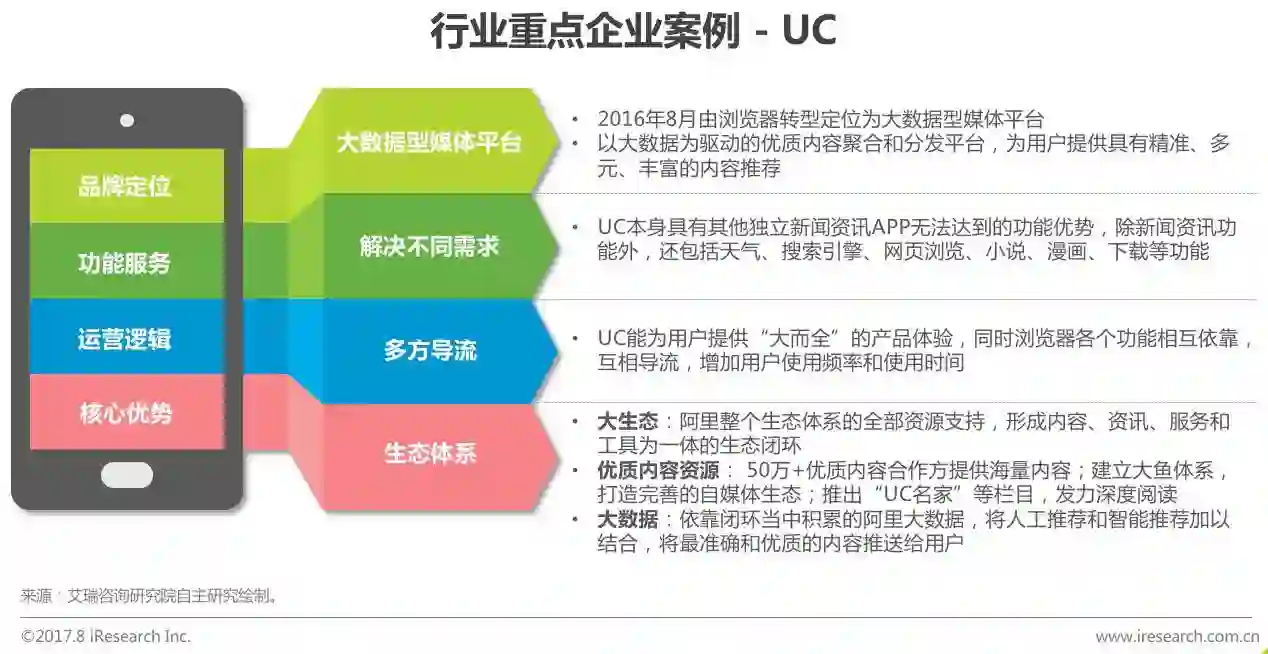 作为阿里体系的一员,整个阿里生态闭环保证了UC的资源和技术算法优势,再利用大鱼号平台补齐重要的自媒体板块,全面实现优质内容的组织、聚合与分发。同时,UC原有的大量用户基础,即使对于新闻资讯需求度不高的用户,也可以满足基本的时效性资讯需求,和其他独立新闻资讯APP区隔性很高。功能的多样性使其有撬动其他产品主流用户的潜力。从新闻推荐方式上来看,UC采取的是主动选取兴趣点+算法推荐。自行选取频道的方式自主性较高,方便定制新闻,匹配阿里大数据,算法推荐更加精准。截止到2017年7月,UC整体日活近亿,其中UC资讯版块经过加码审计的日活超过4600万,属于移动新闻资讯APP第一梯队阵营。
