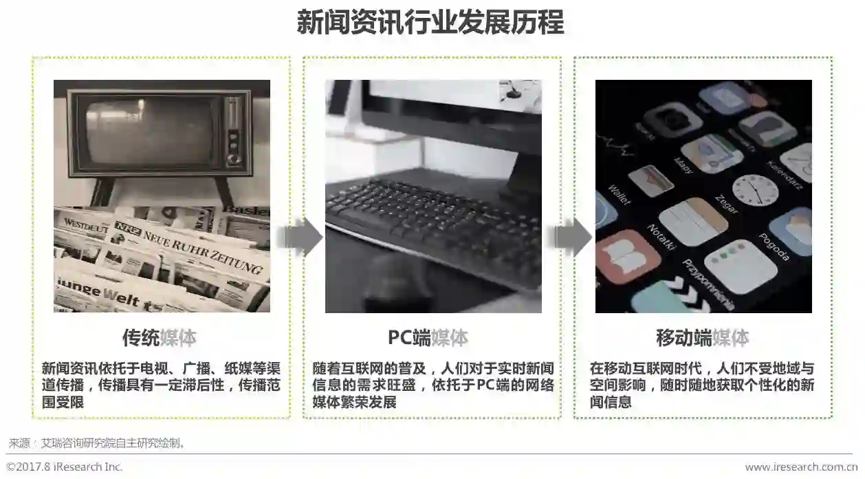 新闻资讯行业伴随着技术的发展,主要经历了三个阶段:传统媒体时代信息传播主要依托于电视、广播、纸媒等渠道,传播及时性较弱,传播范围也受一定限制。随着PC电脑和互联网的普及,传统媒体时代信息滞后性的缺点被彻底颠覆,人们可以通过电脑随时获取全球各地的新闻资讯。当发展到现在的移动互联网时代,新闻资讯行业再一次得到进步,用户可以通过移动设备、随时随地获取最及时且最符合个人兴趣和需求的资讯内容。