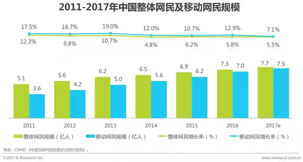 中国移动互联网网民和整体网民规模继续缓慢上升,但整体增速进一步放缓。网民继续向移动端渗透,预计在2017年底,中国整体网民规模将会达到7.7亿,移动互联网用户规模会达到7.5亿。庞大的网民数量为新闻资讯行业积累了庞大的用户基础,随着移动互联网渗透率继续稳步扩大,新闻资讯行业将会进一步发展。