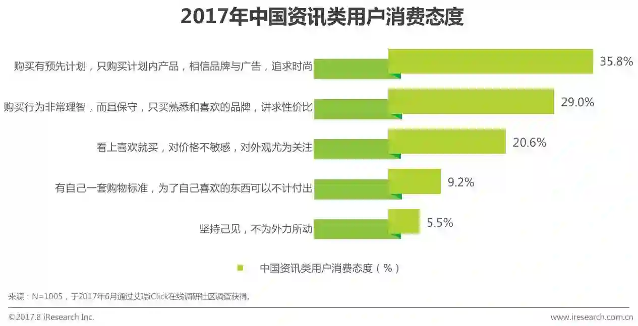 新闻资讯类APP用户的消费态度差异性较大,最主流的用户会设定预先的购买计划,计划消费,但他们相对相信品牌与广告,且追求时尚,占比35.8%。另外,保守型用户也占到了近三成,他们购买行为非常理智且保守,关注性价比。