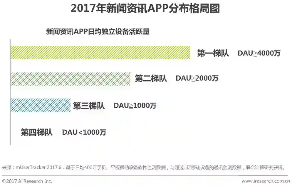 目前行业上的新闻资讯APP产品众多,但从流量上来看,梯队划分明显。第一梯队的DAU流量在4000万以上,且明显高于后续梯队的产品,但此梯队产品数量少(不超过5家),优势明显。第二梯队和第三梯队的产品差异化不高,竞争尤为激烈,DAU在1000万至3000万之间。绝大部分的新闻资讯产品排在第四梯队,日活跃设备数量在1000万以下。