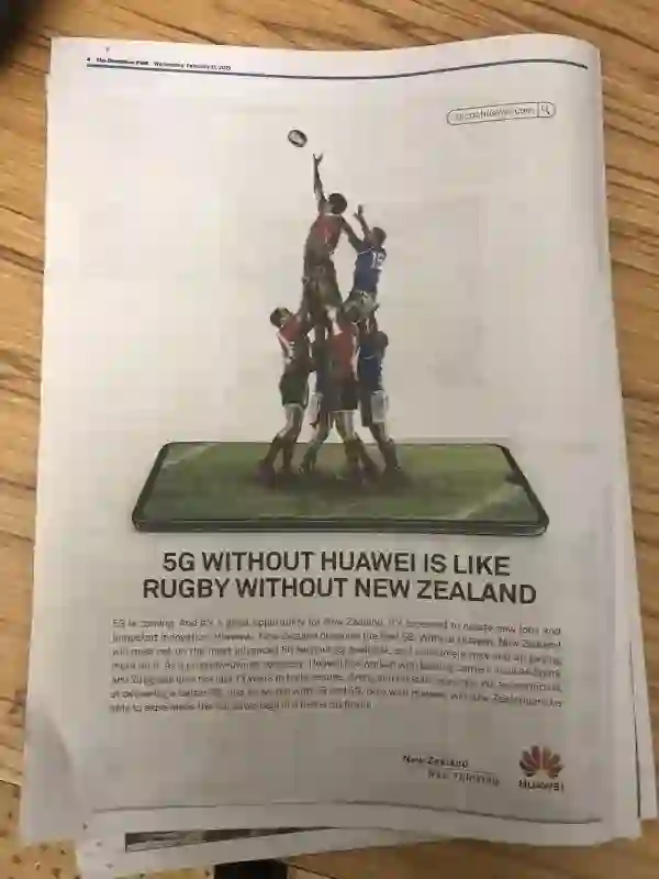 外媒称,新西兰情报机构以国家安全为由,禁止中国华为公司参与当地5G网络基础建设,当地时间2月13日,华为在当地主要报纸刊登整版广告,称:“没有华为参与的5G,就像是没有新西兰队参与的橄榄球比赛一样”。借新西兰热衷的橄榄球运动,批评该国政府禁止华为参与网络建设的决策。