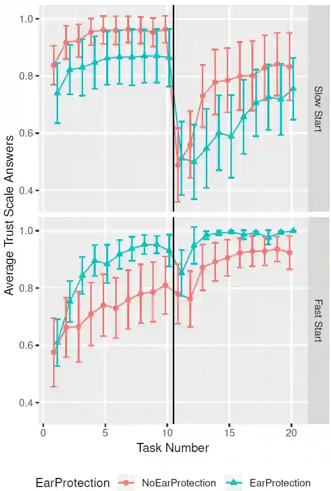 为了验证 H1,作者在机器人移动速度改变前后对信任分数进行了 Wilcoxon 秩和检验。测试表明,速度提高场景中的参与者与有(W=88,p<0.01)和没有护耳器(W=100,p<0.01)的参与者之间存在显著差异,而对于速度下降场景中的参与者,则没有显著差异。