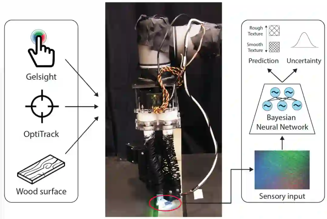为了解决自适应打磨系统的感知问题,本文提出了一个由 Gelsight 感知输入、用于学习表面粗糙度表示的卷积神经网络(CNN)和用于触摸表面的柔性机器人执行器组成的感知系统。作者开发和训练了两个贝叶斯 CNN 模型,用于基于 Gelsight 图像的打磨木材表面粗糙度分类和比较。此外,还提出了一种新的不确定性感知预测算法,利用贝叶斯不确定性估计进行推理。完整的系统结构如图 1。