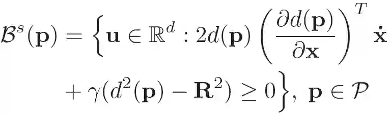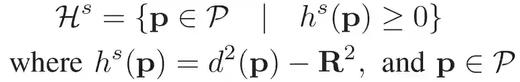 屏障证书(Barrier certificates)或屏障函数(Barrier functions)用于确保机器人始终处于安全的环境中。控制器在采取尽可能接近标准动作的控制动作时,应满足屏障证书的要求。作者对本文讨论的应用环境进行了简化表述,以得到类似于公式(4)的安全集合: