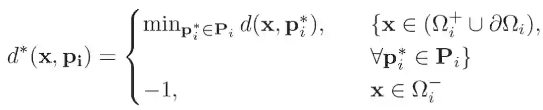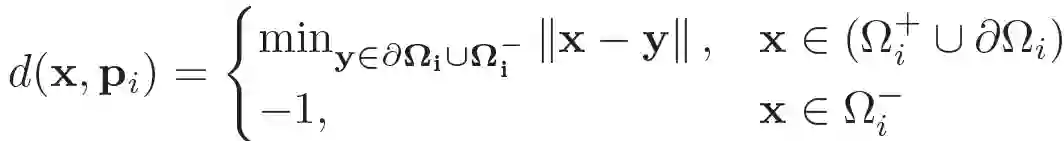针对无人机竞赛应用领域,本文基于机器人学中的常见表征,提出了安全约束。假设我们的障碍物模型是一个静态模型,通过欧几里德符号距离场(Euclidean signed distance field,ESDF)启发得到的距离变换来表示。对于一个障碍物 i,姿态表征为 p_i,定义三个区域:(Ω_i)- 表示障碍物内部,(Ω_i)+ 表示障碍物外部,∂Ω_i 表示障碍物边缘。对于 3D 空间 x 中的任意点,即机器人的位置,定义一个到障碍物 i 的自定义距离函数,如下所示: