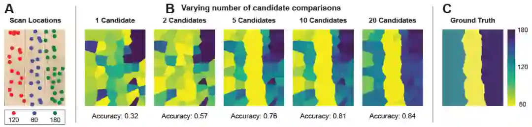 图 5A 显示了使用本文系统的 Gelsight 扫描的测试板和空间位置。每个点的颜色代表扫描位置的地面真实砂砾。使用具有不确定性感知权重的绝对分类器可以达到 85.3% 的纹理分类准确率。对于相对纹理分类,在每个扫描位置输入该位置的当前扫描以及已知砂砾的 “候选” 基线子块。这个候选子块可以直接从训练库中获取,也可以从一个单独的带标注的候选数据库中获取。模型能够预测当前扫描(未知砂砾)和另一个已知砂砾候选扫描之间的砂砾度。对比不同砂砾级别的几个候选数据,可以预测当前扫描的砂砾。图 5B 给出了添加更多候选样本的可视化效果,同时继续利用不确定性加权算法过滤出扫描的高不确定性区域。基于空间距离最近的扫描预测,通过对区域进行空间着色来生成可视化热图。预测的准确度是根据真实砂砾分类计算得到的(图 5C)。