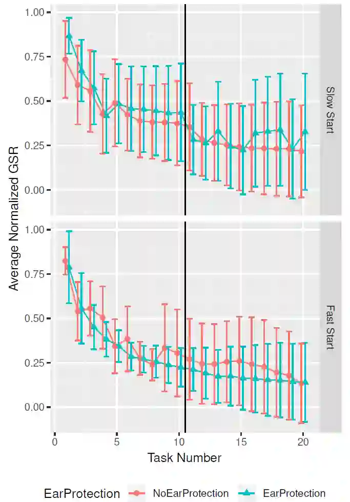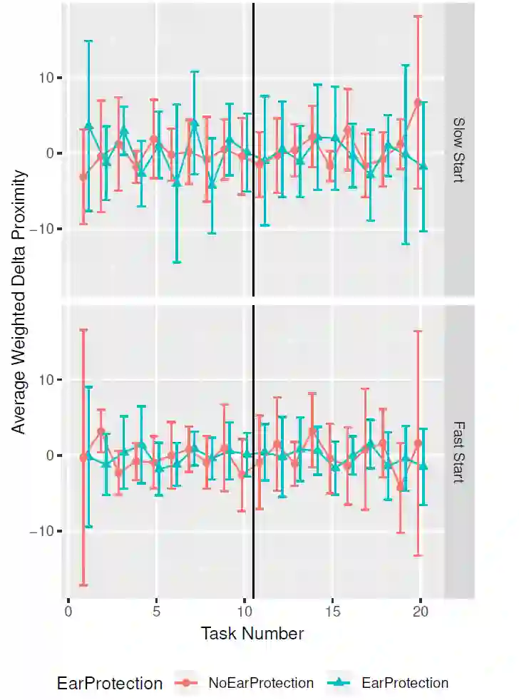 H2:机器人手臂移动速度的变化以及参与者是否佩戴了护耳装置,对参与者的运动的影响。
