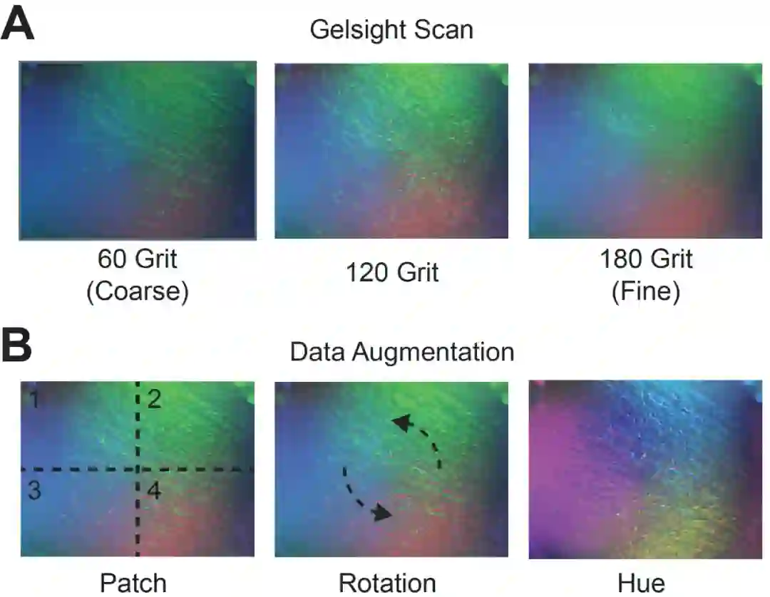 图 2. 样本数据和增强数据样本。随机抽样扫描(A)三种不同的表面材料,从粗(左)到细(右)。(B)为实现平移、旋转和色调不变性,增强处理后的数据样本