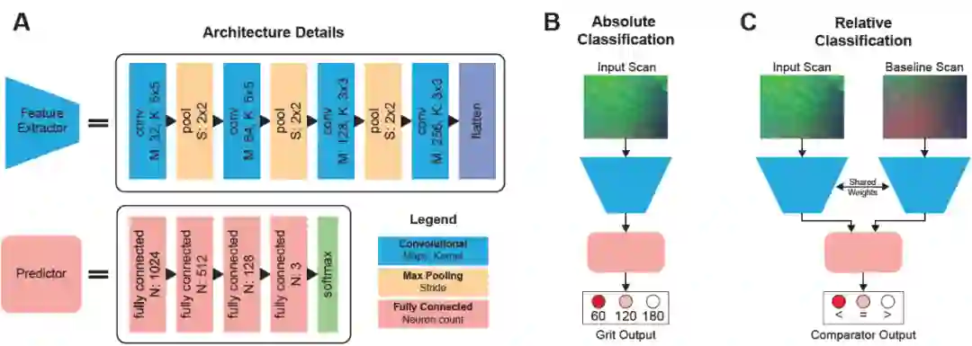 在绝对纹理分类任务(图 3B)中,端到端模型将从单个扫描输入中学习到的特征输入到预测器模块中,预测器模块被训练来预测纹理的绝对粒度(60、120、180)。在相对纹理分类中,使用一个双输入头从两个扫描中同时学习特征,然后在输入预测模块之前将学习到的特征组合成一个单一的特征向量。由于最终目的是在两个特征提取器之间强制实现所学特征的一致性,所以作者在这两个头之间显式共享训练和测试期间的权重。