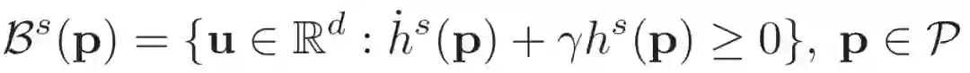 基于零控制屏障函数(Zeroing Control Barrier Functions,ZCBF)和 SBC 理论,控制器 u 需要满足一定的条件以保证安全集的前向不变性(Forward invariance)。令连续可微函数 h^s 表示一个 ZCBF,容许控制空间可定义为: