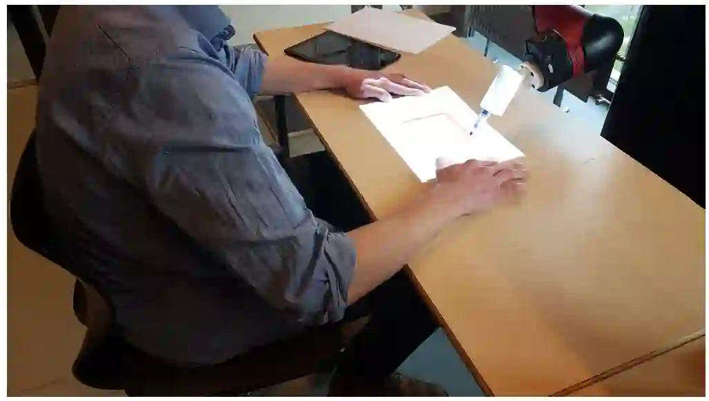 要求参与者再次拿起一张新的纸,重复这个任务直到测试结束。在测试之前,将电极连接到参与者的肩膀后面,与他们的手相对。将测量 GSR 的蓝牙设备绑在他们的上臂。GSR 装置通过测量连接电极之间皮肤的导电率来推断参与者的反应水平。