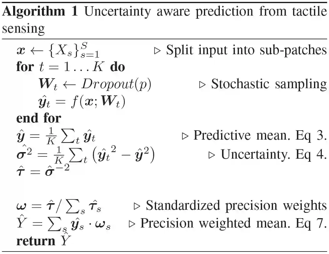 通过上述处理步骤,可以将不确定性估计与预测相融合,从而实现不确定性感知推理。这在软机器人领域中是极其重要的。在实际部署过程中,由于软机器人的传感器未完全按下,或者传感器的一部分离开目标兴趣区域等原因,不确定性感知推理系统的扫描结果会遇到较为严重的噪声问题。为了解决这一问题,作者引入一种在潜在噪声触觉扫描中获得可靠预测的算法,该算法基于每个子部分的不确定性将扫描子部分的预测组合起来。