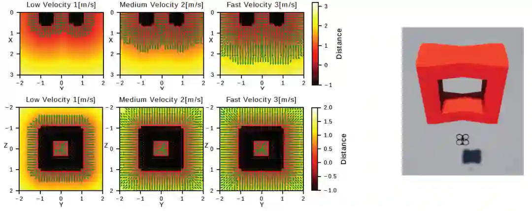 对于无人机竞赛中的应用,目标是将方形门视为障碍物(见图 14)。另外,考虑到公式(2)中的有限边界和我们所有的障碍物都是相同的,本文使用公式(2)对机器人在感兴趣区域内相对于门的一组采样姿势预计算符号距离场,从而创建一个距离地图。
